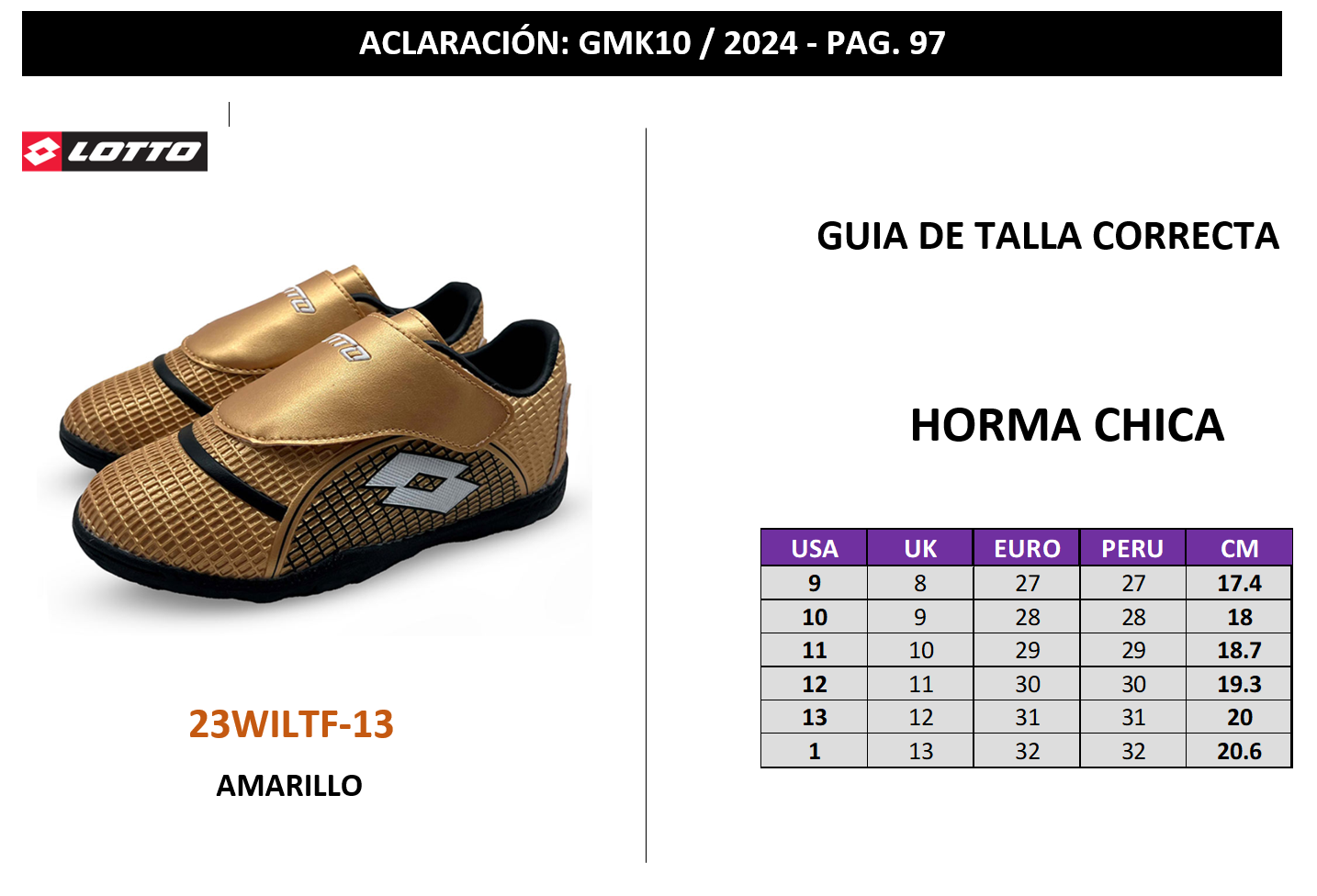 Se adjunta la guía de tallas del modelo LOTTO 23WILTF-13