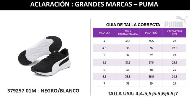 Se adjunta la guía de tallas correcta del modelo PUMA 379257 01M en color Negro/blanco .