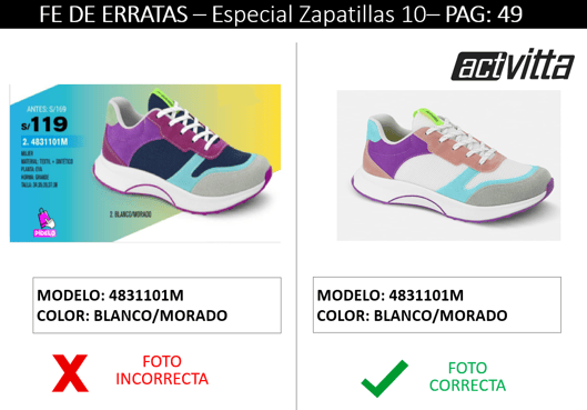 Se adjunta Fe de Erratas por error de foto del modelo ACTVITTA 4831101 en color BLANCO/MORADO .