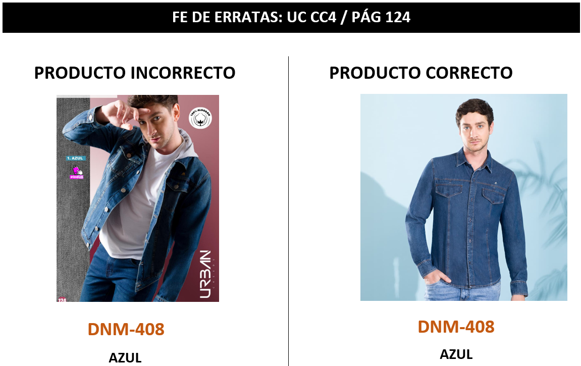 Se hace el envío del FE DE ERRATAS que visualiza el PRODUCTO correcto del modelo DNM-408 de color AZUL de marca URBAN CREEDS en el catálogo URBAN CREEDS CC4.