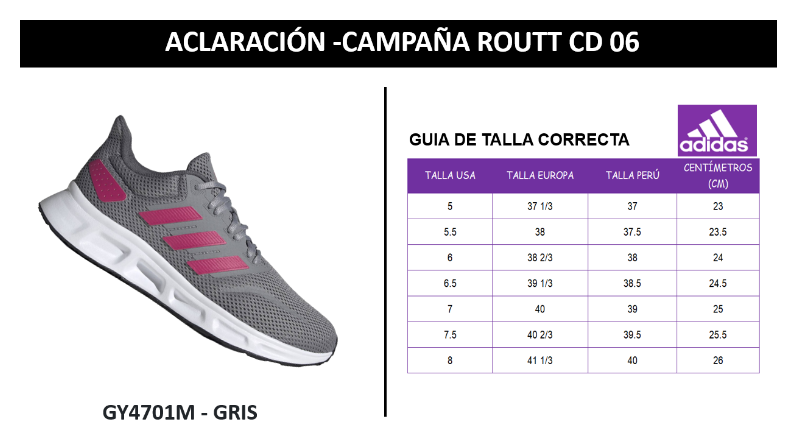 Se realiza aclaración del modelo GY4701M  en color GRIS , debido a la distribución de talla de la zapatilla, el cual es diferente a la guía de tallas de la plataforma SMARTPor esta, razón se está adjuntando la guía de tallas correcta del modelo ADIDAS GY4701M.