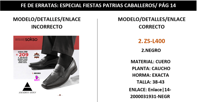 Se presenta el FE DE ERRATAS del modelo ZS-L400 del color NEGRO del catálogo ESPECIAL FIESTAS PATRIAS CABALLEROS de marca AMADEO ASTO.