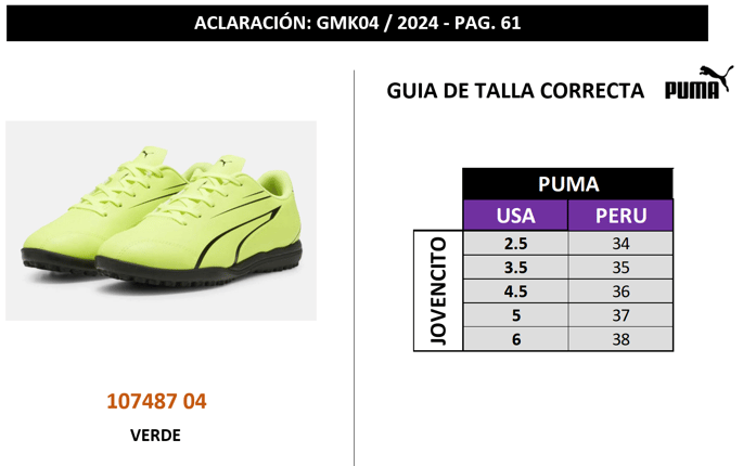 107487 04 || GMK04 || ACLARACIÓN Se realiza aclaración del modelo 107487 04 en color VERDE , el cual es diferente a la guía de tallas de la plataforma SMART. Por esta, razón se está adjuntando la guía de tallas correcta del modelo.