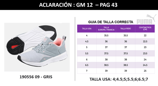 190556 09 || GM 12 || ACLARACION Se adjunta la Guía de tallas correcta del modelo PUMA 190556 09 en color Gris para damas .
