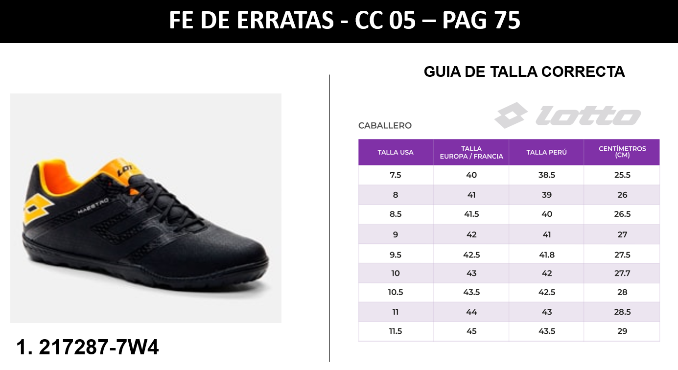 217287-7W4 || CC 05 || FE DE ERRATAS Se realiza el siguiente FE DE ERRATAS por un error en la talla del modelo LOTTO 217287-7W4 en color Negro/Naranja.