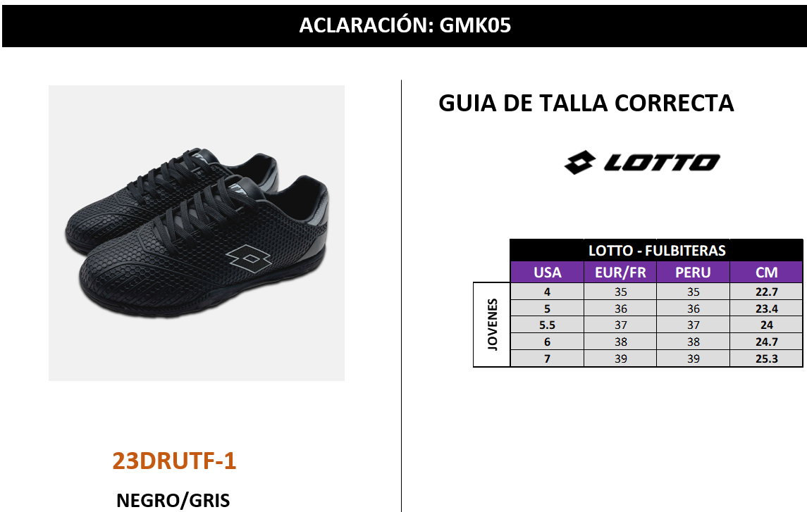 23DRUTF-1 || GMK05 || GUIA DE TALLAS Se adjunta la guía de tallas correcta del modelo LOTTO 23DRUTF-1 en color negro/gris.