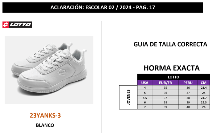 23YANKS-3 | GUIA DE TALLAS || ACLARACIÓN Se adjunta la guía de tallas del modelo LOTTO 23YANKS-3 en color BLANCO .