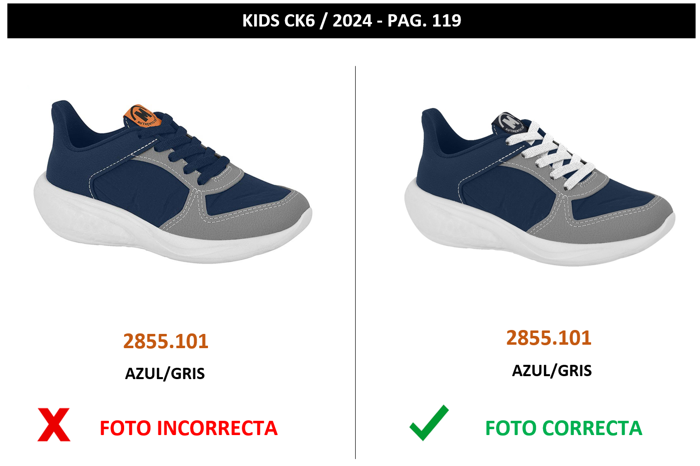 2855.101 || CK6 || FE DE ERRATAS Se adjunta el Fe de erratas indicando la foto correcta del modelo MOLEKINHO 2855.101 color AZUL/GRIS.