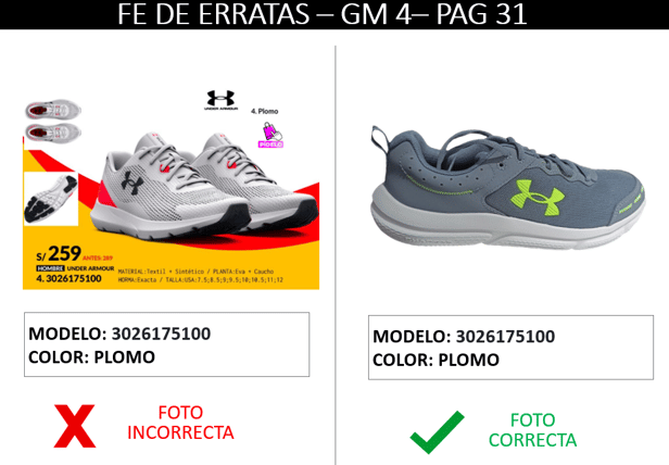 3026175100 || Grandes Marcas 04 || FE DE ERRATAS Se adjunta Fe de erratas del modelo Under Armour 3026175100 por error de Foto .