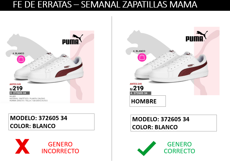 372605 34 || Semanal Zapatillas || FE DE ERRATAS Se adjunta el FE de ERRATAS del modelo Puma 372605 34 en color Blanco por error de Genero .