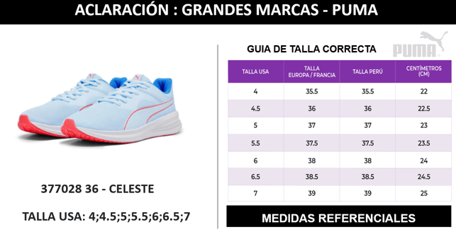 377028 36 || GUIA DE TALLAS || ACLARACION Se adjunta la guía de tallas de los modelos PUMA 377028 36 en color CELESTE .
