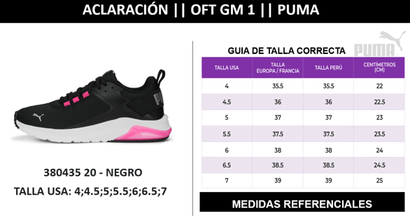 Se realiza aclaración del modelo 380435 20 en color NEGRO , debido a la distribución de talla de la zapatilla, el cual es diferente a la guía de tallas de la plataforma SMART. Por esta, razón se está adjuntando la guía de tallas correcta del modelo PUMA 380435 20 .
