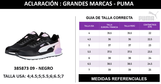 385873 09 || GRANDES MARCAS || ACLARACION Se adjunta la guía de tallas correcta del modelo Puma 385873 09 en color Negro .