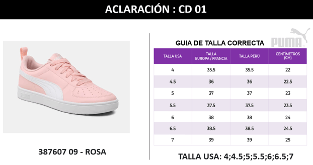 387607 09 || GUIA DE TALLAS || CD 01 Se adjunta la guía de tallas de los modelos PUMA 387607 09 en color Rosa .