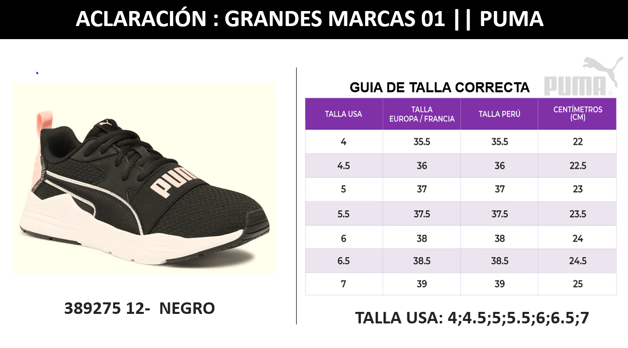 Se realiza aclaración del modelo 389275 12 en color Negro , debido a la distribución de talla de la zapatilla, el cual es diferente a la guía de tallas de la plataforma SMART. Por esta, razón se está adjuntando la guía de tallas correcta del modelo PUMA 389275 12.