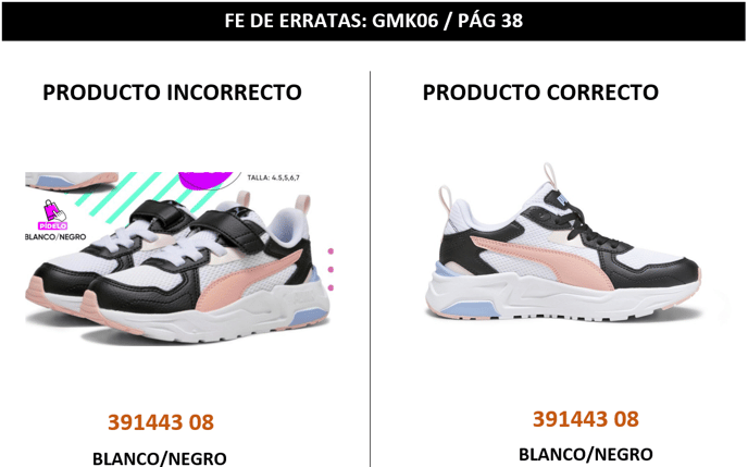 391443 08 || GMK06 || FE DE ERRATAS Se hace el envío del FE DE ERRATAS que visualiza el PRODUCTO correcto del modelo 391443 08 de color BLANCO/NEGRO de marca PUMA en el catálogo GMK06.
