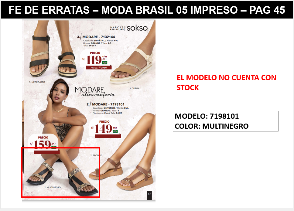 7198101 || FE DE ERRATAS || MODA BRASIL 05 IMPRESO El modelo 7198101 color MULTINEGRO, no cuenta con stock ya que no paso las inspecciones de calidad.