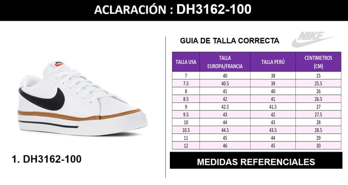 DH3162-100 || ACLARACION Se adjunta la aclaración por guía de talla del modelo DH3162-100 en color Blanco/Negro
