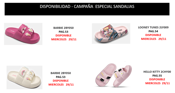 ESPECIAL SANDALIAS || DISPONIBILIDAD Se muestra la disponibilidad de ingreso de los siguientes modelos del Especial Sandalias: 2BY050 , 2LY009 , 2BY050 , 2CHY00.