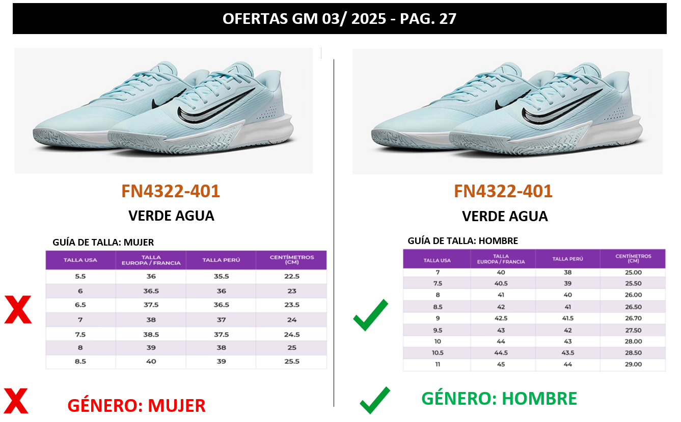 FN4322-401 || GRANDES MARCAS 03 || FE DE ERRATAS EL GÉNERO CORRECTO, PARA EL MODELO FN4322-401 COLOR VERDE AGUA, ES HOMBRE. ADEMÁS, SE ACLARA LA GUÍA DE TALLAS