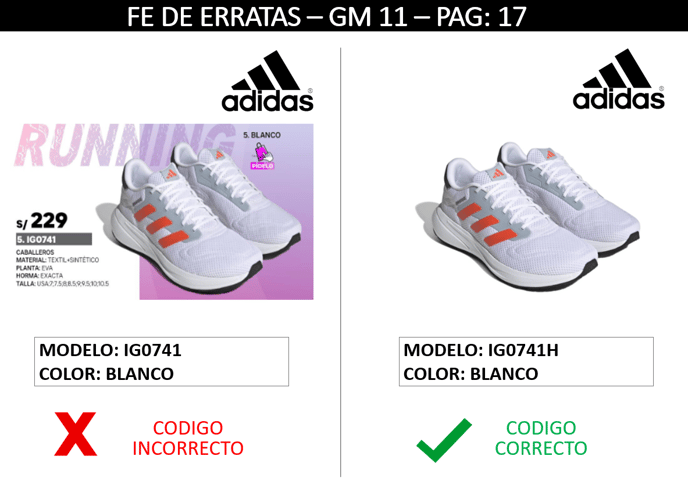 IG0741 || GM 11 ||FE DE ERRATAS Se adjunta FE DE ERRATAS por error de CODIGO del modelo ADIDAS IG0741 EN COLOR BLANCO . El código correcto es IG0741H.