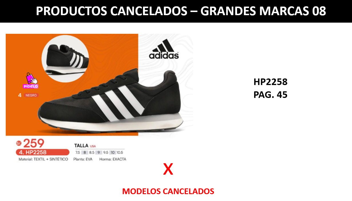 HP2258 || GM 08 || DISPONIBILIDAD El modelo ADIDAS HP2258 en color Negro del catálogo Grandes Marcas 08 ha sido cancelado.