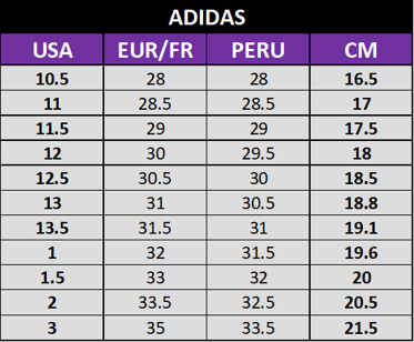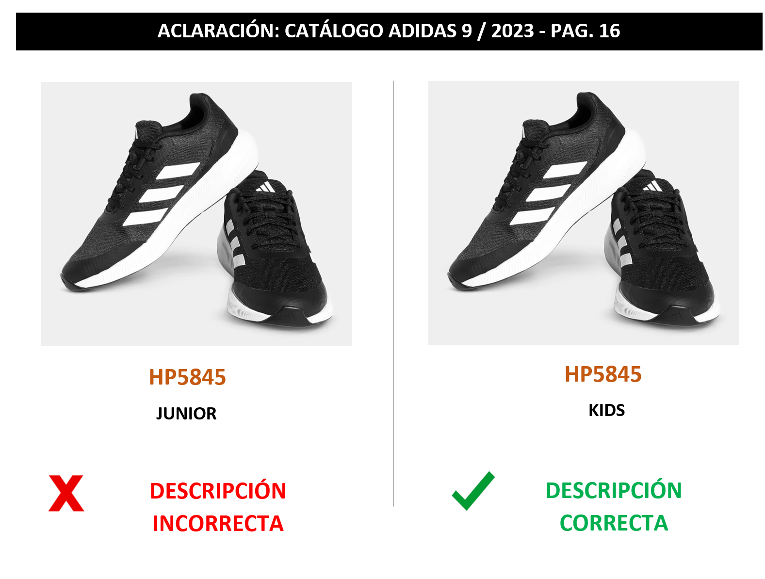 HP5845 || ADIDAS 9 || ACLARACIÓN Se realiza la aclaración del modelo HP5845 en color NEGRO/BLANCO, debido a que este es un modelo esta en la descripción como JUNIOR y la descripción correcta es KIDS. GUÍA DE TALLAS: