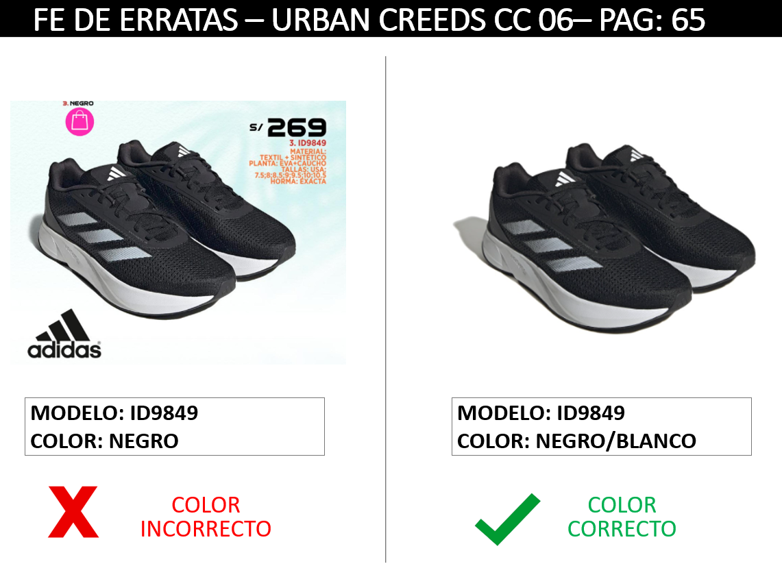 ID9849 || URBAN CREEDS CC 06 || FE DE ERRATAS Se adjunta FE DE ERRATAS por error de color del modelo ADIDAS ID9849 . El color correcto de este modelo es NEGRO/BLANCO.