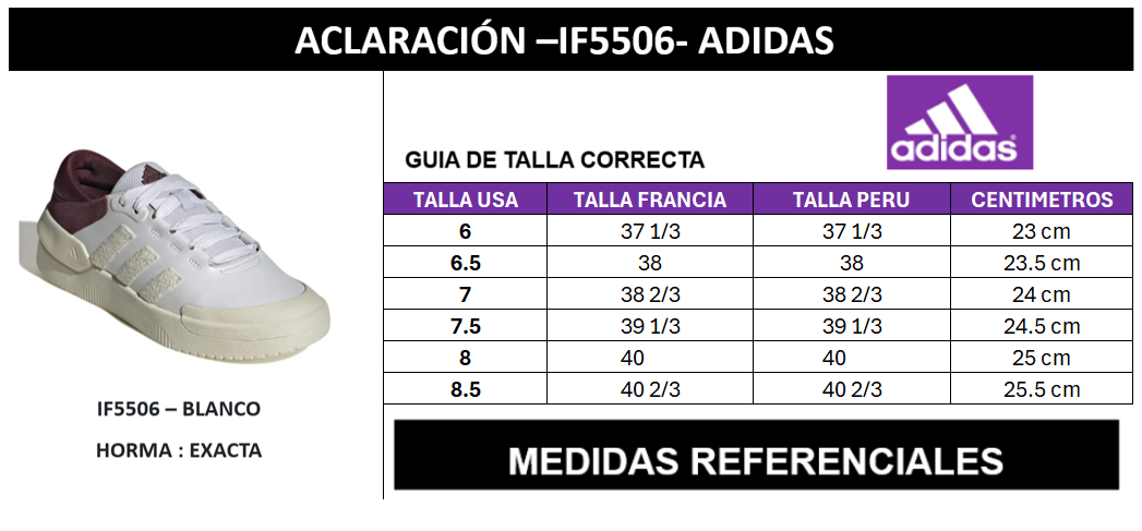 IF5506 || Guía de tallas || Aclaración Te compartimos la Guía de tallas correcta del modelo ADIDAS IF5506 en color Blanco. La horma del calzado es exacta.
