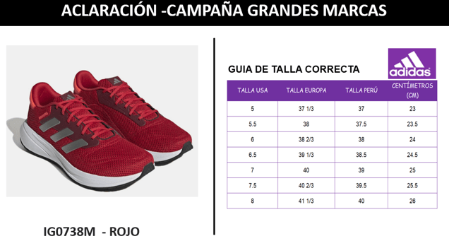 IG0738M || GRANDES MARCAS || GUIA DE TALLAS SE adjunta la guía de tallas correcta del modelo ADIDAS IG0738M en color ROJO.