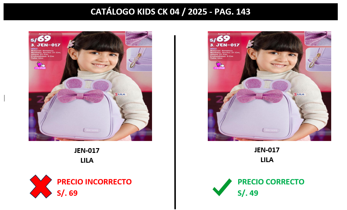 JEN-017 || KIDS CK4 || FE DE ERRATAS || CORRECCIÓN DE PRECIO SE CORRIGE EL PRECIO DEL MODELO JEN-017 COLOR LILA, DE 69 A 49 SOLES.