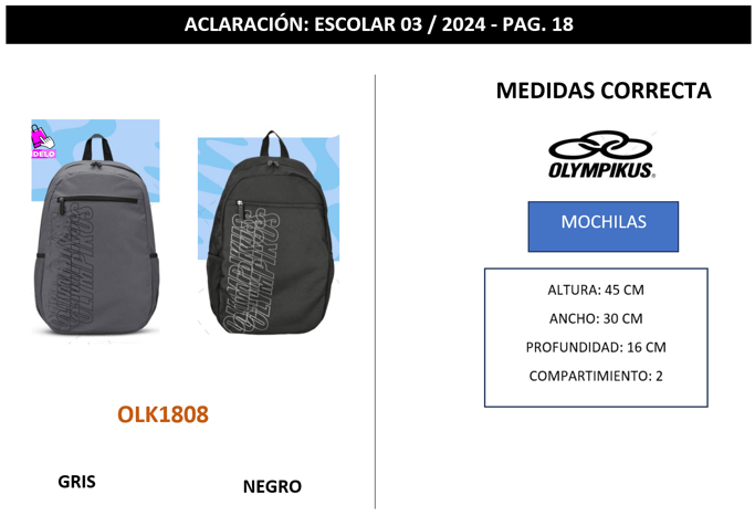 OLK1808 || ESCOLAR 03 || ACLARACIÓN Se realiza aclaración del modelo OLK1808 en color GRIS y NEGRO, con las medidas correctas de las mochilas.