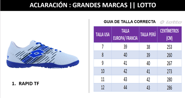 Se adjunta la guía de tallas de LOTTO RAPID TF.