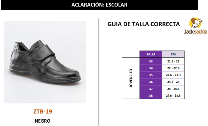 ZTB-19 || ESCOLAR || GUIA DE TALLAS Se adjunta la guía de tallas correcta del modelo Jack & Jackie ZTB - 19 en color negro.